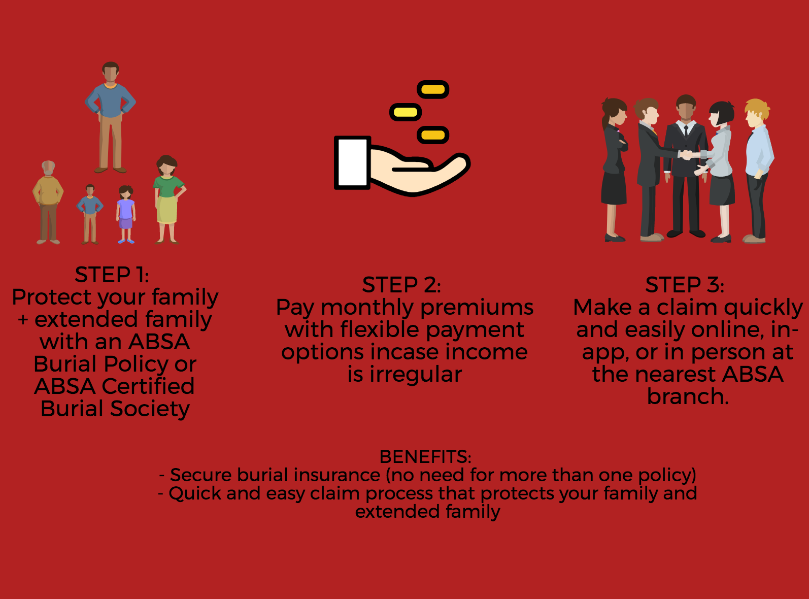 Protect your family and extended family financially by ensuring your burial is taken care of. ABSA offers a certified insurance program that allows for flexible payments at local Pick'n'Pays or ABSA locations. Our policy is secure, so you have no need to purchase any other burial insurance policies.